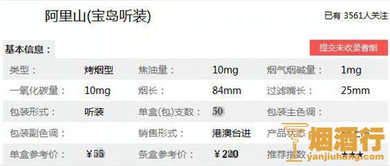 阿里山1905罐装宝岛香烟核心参数: