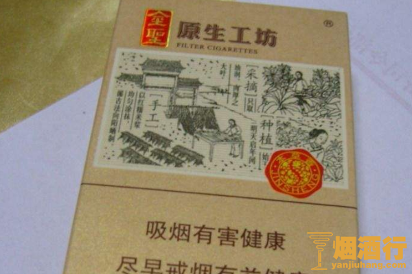金圣(原生工坊)的包装以浅棕色为主,正面印有黑白风景画,其口感柔顺,烟气适中,带有一股独特的西洋参味,有一定的刺激性,抽起来不是很舒服。