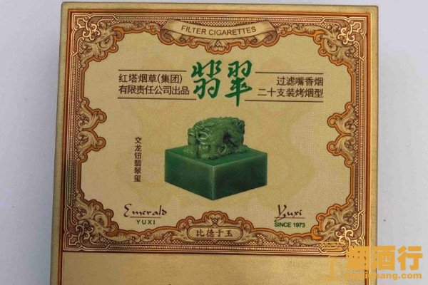 玉溪(双中支翡翠)的包装采用了金色作为底色,正面印有玉溪图案和金色的纹样,其味道醇厚,带有一股植物清香,且烟气饱满,没有杂气,可以用作日常口粮。