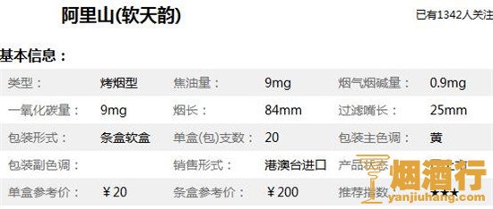 阿里山软天韵香烟价格是多少