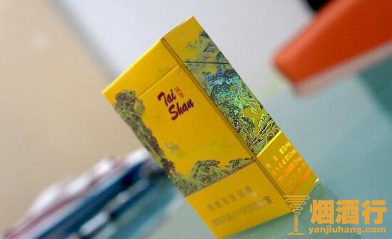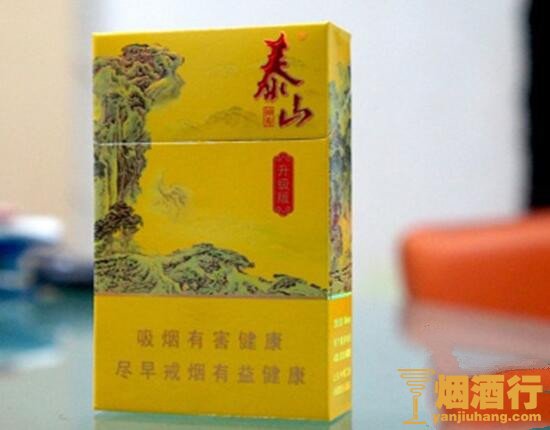 包装:整体的包装风格大气奢华,以泰山神秀之景色为主题设计背景,彰显拔地高耸,意境悠远的独特魅力。以明黄为主题色系,商标等文字设计竖排模式,充分体现泰山卷烟雍容华贵,文化底蕴深厚。让人一看就十分的喜欢,是一款极具眼缘的上乘香烟。