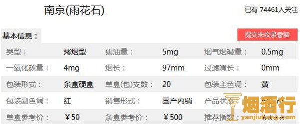 南京雨花石细支香烟核心参数: