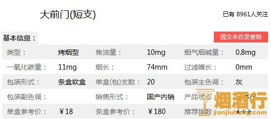 大前门香烟核心参数: