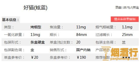 在好猫炫蓝香烟价格表图中它性价比非常高,在同档香烟中很有市场竞争力,它突出清香风韵,本香突出,很多烟民对它都极为喜爱。它的焦含量适中,满足感也很不错,它是一款典型的大众型口粮烟,在陕西一带超火。据了解地区不同销售价格也存在很大的差别,具体如下: