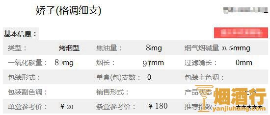 娇子香烟核心参数: