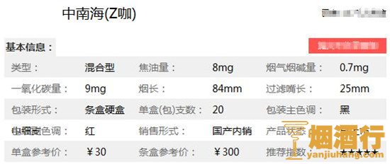 中南海香烟核心参数: