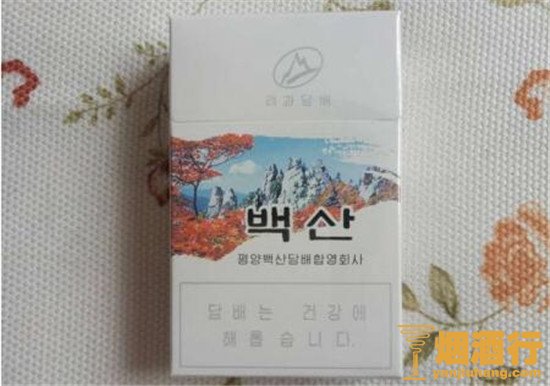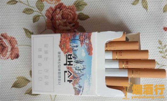 包装:外观以白色为主,配以七宝山风景画,格调清新优雅,七宝山是朝鲜最具代表性的景点之一,包装风格充分彰显了本土特色,很接地气的设计,给人很好的视觉享受。烟支的设计中规中矩,黄色过滤嘴,白色烟身,给人很自然的感受。