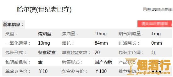 哈尔滨老巴夺香烟核心参数: