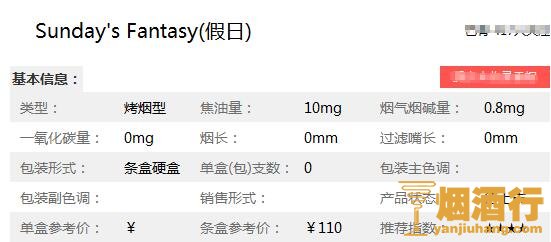 在了解了英国Sunday's Fantasy(假日)香烟多少钱一包之后,为了大家能更详见的了解此烟,小编特意将假日香烟核心参数进行了整理,以便于对它进行更深入的了解。