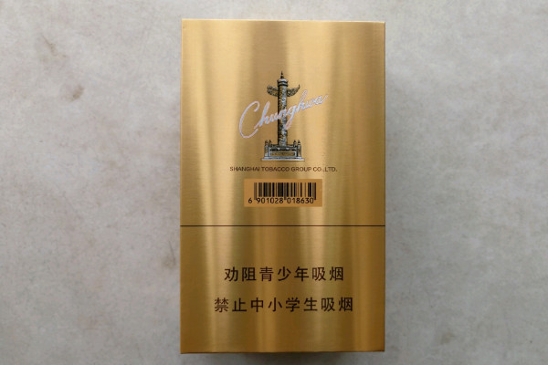 中华(金短支)包装比普通烟盒较短,开口朝上,印有深蓝色封条,整体风格高贵典雅,大气上档次,而且香烟中梅子香味较浓,味道清淡。