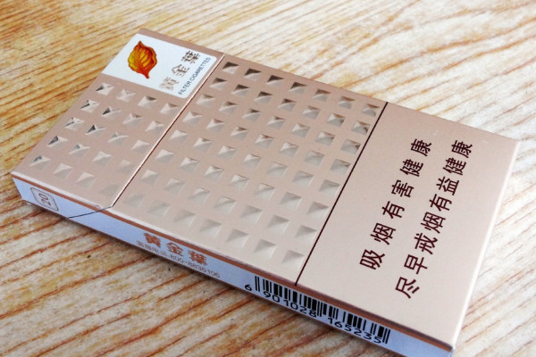 黄金叶(爱尚)采用香槟色为主色调,右上角印有烟叶标志和logo,正面印有排列规则的矩形小方块,风格简约,香烟劲道适中,吸后鼻腔中带有辣感,满足感较强。