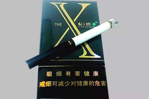 娇子(X玫瑰)包装设计简洁典雅,整体以黑色为主色调,烟盒正面印有醒目的金色X字母,给人一种深沉内敛的感觉,而且烟支在品吸时带有浓郁的玫瑰香味。