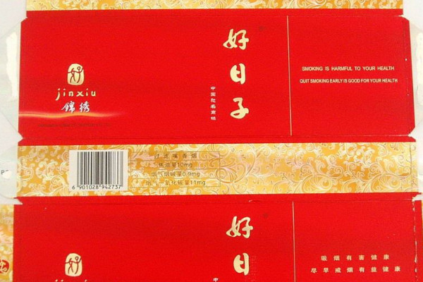 好日子(锦绣)包装以红、金两色为主色调,整体风格为高端典雅,给人一种喜气大气的感觉,而且烟支的口感细腻柔润,是一款性价比较高的香烟。