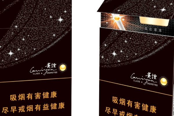 贵烟(跨越)采用了黑色的硬盒包装,并在烟盒上设计有浪漫神秘的星河图案,而且烟支内含陈皮爆珠,捏碎后具有一股淡雅清新的陈皮香味。