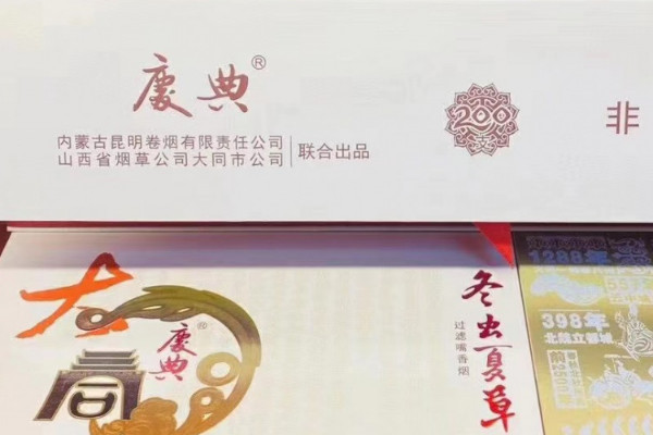 冬虫夏草(大同庆典)的包装以淡黄色为主色调,并在香烟上印有金色的花纹图案,整体风格简约大气,而香烟的焦油含量低,仅有6mg,属于低焦油害香烟。