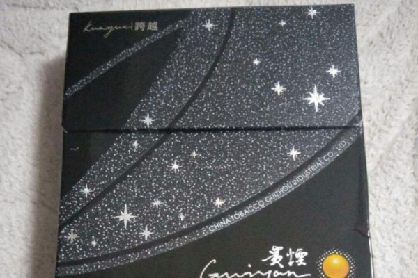 贵烟(跨越烟)是贵烟品牌下的一款香烟,外观以黑色为主,正面有银河星空图案,包装简洁好看,打开包装可以闻到一股烟草香,口感润滑,带有一点辣味,烟气饱满劲道,捏开爆珠后,带有淡淡的桂皮香气。