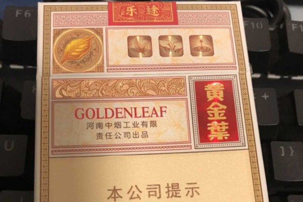 黄金叶乐途中支的包装以淡黄色为主,正面有河南中烟工业有限责任公司出品的字样,右侧是红色背景的黄金叶字样,上半部分印着带有圆形纹样的烟叶图案和三个小图案,口感平顺,烟气淡雅,有一定的后劲且价格偏贵。