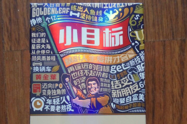 黄金叶(小目标)的包装以白色为主,正面有一个人举着小目标的旗帜,周围有许多小标语,外观十分有趣,其口感顺畅,味道较淡,有一定的后劲,且烟气饱满。
