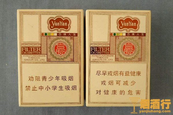 云烟(百味人生)采用纸质硬盒包装,以白色为底色,搭配有红色图标,整体风格简约大气,且该香烟具有一烟多味的特点,一款香烟中有五种不同味道的烟支,正如名字而言,带着消费者领略人生百味。