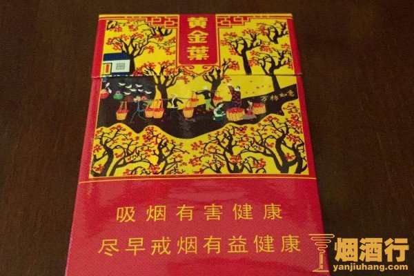 黄金叶(万柿如意)包装以红黄配色为主,正面印有果实累累的柿子树图案,给人一种丰收、吉祥、喜悦的感觉,且香烟以津巴布韦生产的烟叶为原料制作,带有淡淡的甜味,余味悠长。