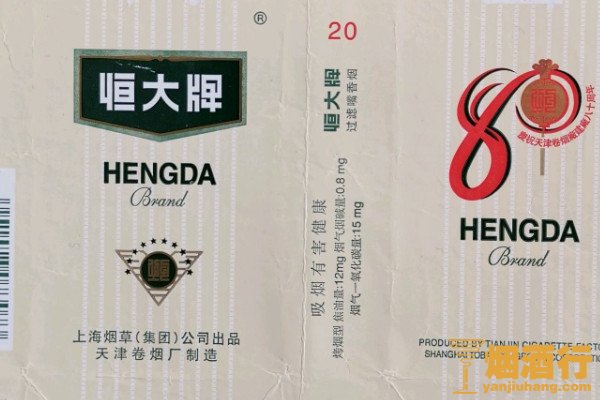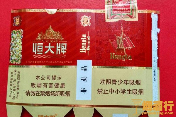 恒大(硬红)是一款老烟,现今在市面上较为少见,其焦油含量为12毫克,烟气中的烟碱含量为0.9毫克,烟支入口淡泊纯净,烟劲非常小,烟气柔和丰满,顺畅通透。
