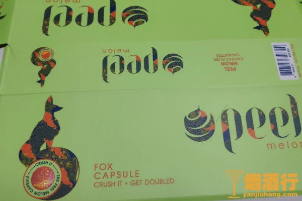 peel(哈密瓜味爆珠)外包装颜色为嫩绿色,中间印刷着产品名称,左下角是一条猎犬图案,烟支焦油含量为9毫克,烟支入口莹润舒适,哈密瓜的味道十分饱满,甜润清爽。