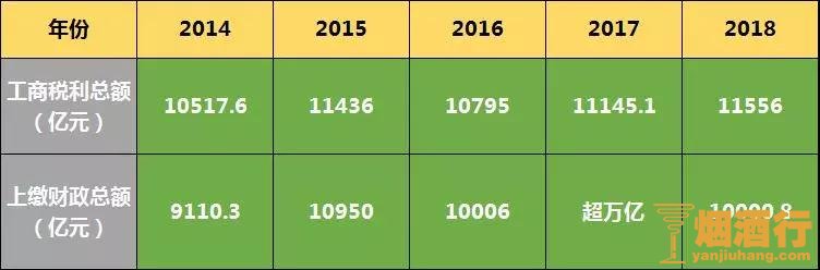 2018年工商税利总额11556亿元,烟草税收占国家财政收入稳定在6%左右