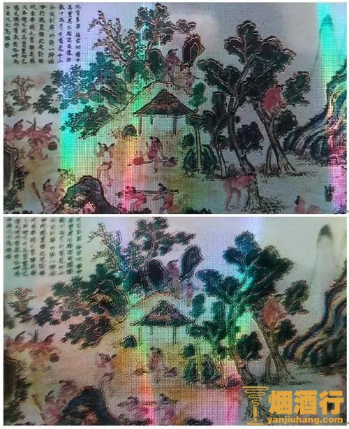 (3)采香图商标印刷真假对比。真品卷烟“采香图”图案清晰,树木烫金线明亮。商标纸底纹为点状,观察呈现网格状。该款假冒卷烟“采香图”图案模糊,树木烫金线暗淡,商标纸底纹无网格状,呈现菱形图案。