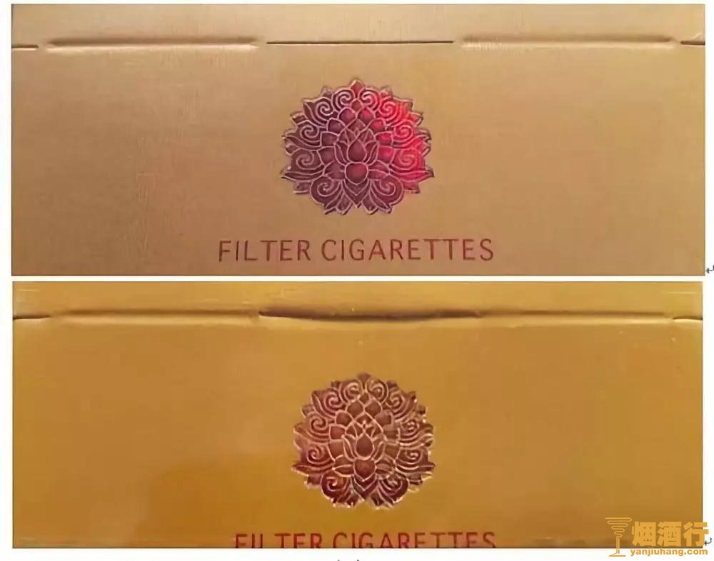 (1)花团图案真假对比。真品卷烟花团图案清晰、立体感强,烫金线明亮。该款假冒卷烟图案模糊,无立体感。