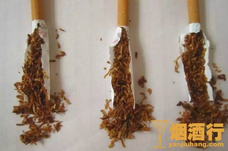 3、看烟丝,真烟的烟丝一般呈黄褐色,真烟的烟丝经过膨化处理,宽度一致,假烟的烟丝烟梗比较多,还有一些黑褐色的烟丝,多烟末,而且假烟的烟丝燃烧性差,经常烧着就熄火了。