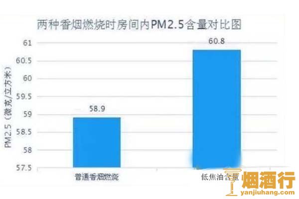 据实验结果表明,普通的粗烟燃烧后释放出的pm2.5明显低于焦油含量低的细支烟,也就是说,低焦油的细支烟燃烧后所释放的有害物质并不会比粗烟低,甚至会高于粗烟一大半。虽然细支烟的焦油含量有所降低,但是所含的致癌物质并不低粗烟的少。