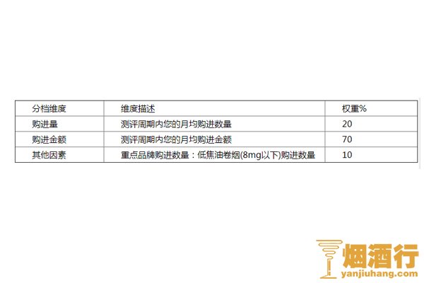 在对零售商档位评测期间,把每个零售商的订烟数量从高到低进行排序。购进数量排名第一的零售商得分最高。其它零售商按照进购数量进行相应的给分。