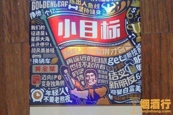 黄金叶(小目标)的上市时间为2017年,烟盒设计十分新颖,其上印刷有各种各样的目标,趣味性十足,烟支入口略淡,随着卷烟逐渐燃烧,浓香味道增强,烟劲略小。