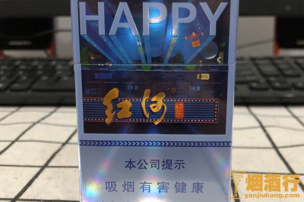 红河(快乐)上市时间为2021年,外包装颜色为浅蓝色,印刷有立体感十足的英文单词,其焦油含量为10毫克,烟气中的烟碱含量为0.9毫克,烟支入口淡雅纯净。